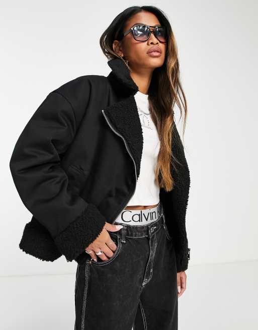 Bolongaro Trevor - Bikerjakke i solid sort denim med detalje i imiteret lammeskind
