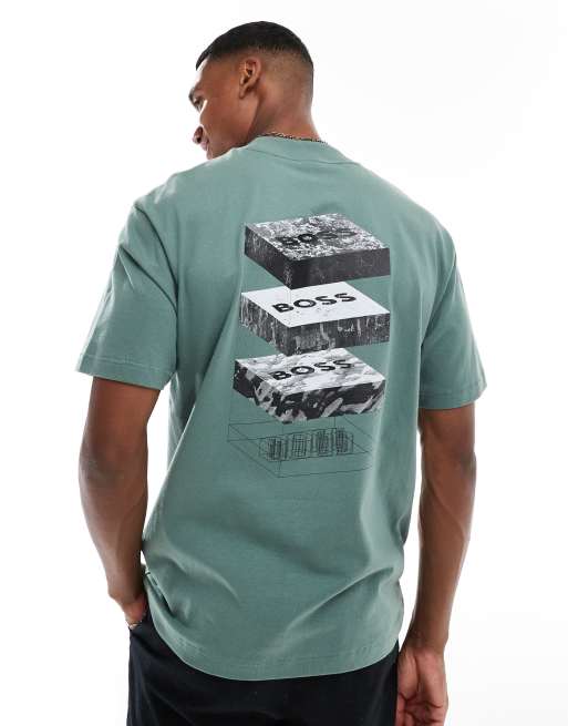 BOSS Orange - Grøn T-shirt med afslappet pasform og geologisk print på brystet og ryggen