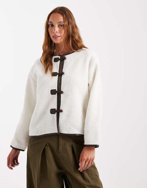 Brave Soul - Cremehvid jakke uden krave med hægtelukninger i imiteret lammeskind
