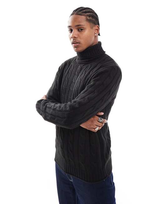 Brave Soul - Sort kraftig kabelstrikket rullekravebluse i afslappet pasform