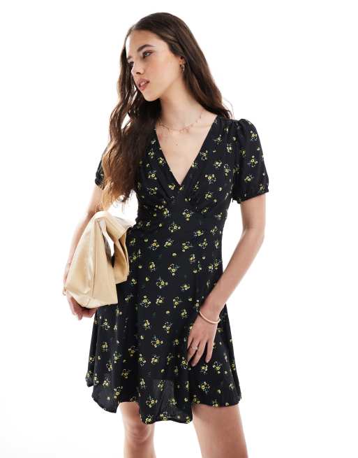 Brave Soul - Sort minikjole med V-hals og blomstermønster