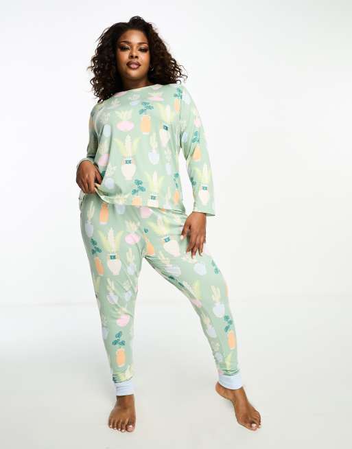 Chelsea Peers Curve - Pyjamassæt med langærmet top og joggingbukser med salviegrønt planteprint i polyester