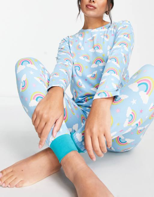 Chelsea Peers - Lyseblåt pyjamassæt med lange ærmer og bukser med tætsiddende buksekanter samt regnbueprint