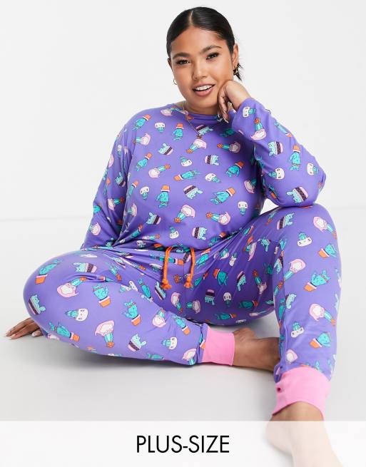 Chelsea Peers Plus - Lilla pyjamassæt med lange bukser med kaktus- og katteprint