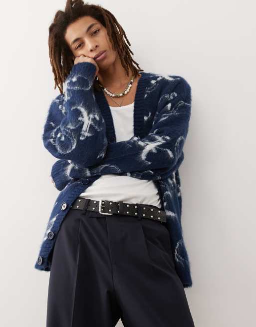 COLLUSION - Blå oversized cardigan med logo i vamset strik