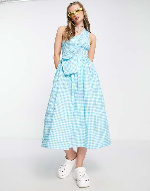 COLLUSION - Blå rynket oneshoulder-midikjole i sommerdesign i gingham med broderi