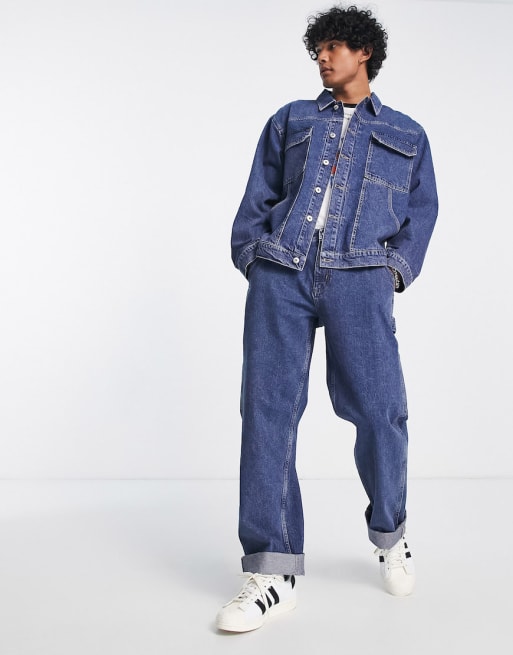 COLLUSION - Blåt sæt med krympet denimjakke og cargojeans