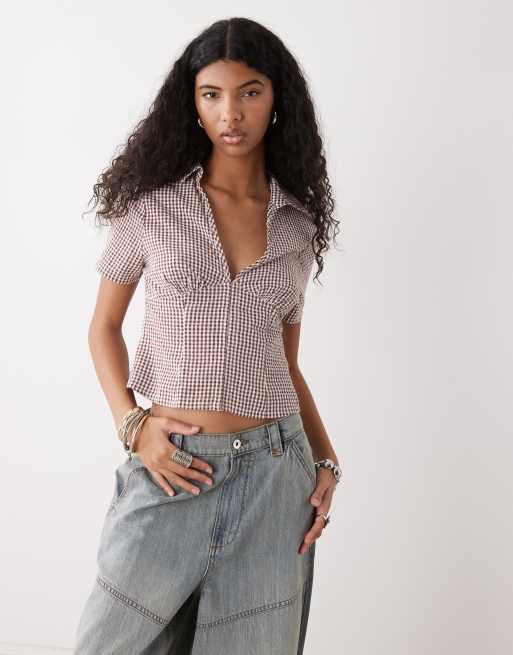 COLLUSION - Brun figursyet kortærmet skjorte med gingham-tern