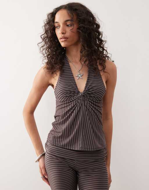COLLUSION - Brun top med halterneck, knude foran og striber