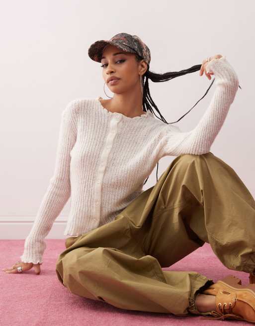 COLLUSION - Ecrufarvet cardigan med bred halsudskæring og bølgekant