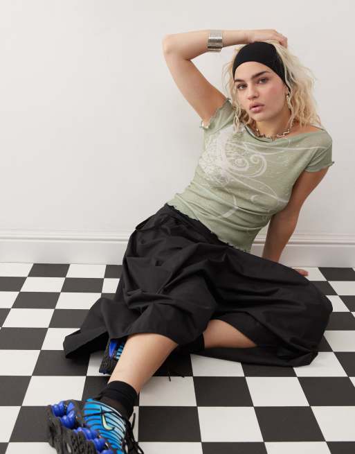 COLLUSION - Grøn halvgennemsigtig overdel med bred halsudskæring og hvirvelprint