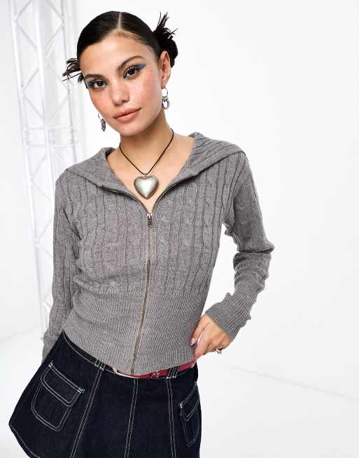 COLLUSION - Kabelstrikket trøje med gennemgående lynlås og oversized krave i gråmeleret