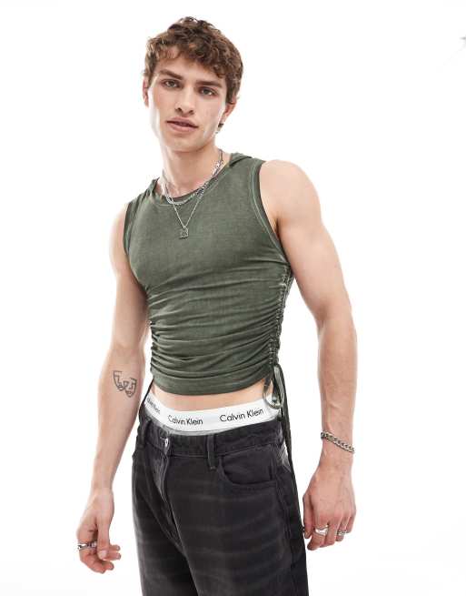 COLLUSION - Kakigrøn og tætsiddende overdel med hætte og bindedetalje