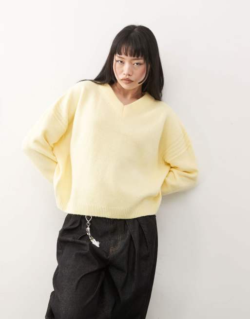 COLLUSION - Lysegul trøje med V-hals i blød strik