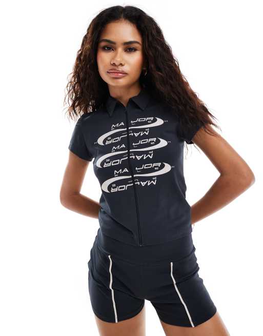 COLLUSION - Marineblå polotop med lynlås og motocross-print - Del af sæt