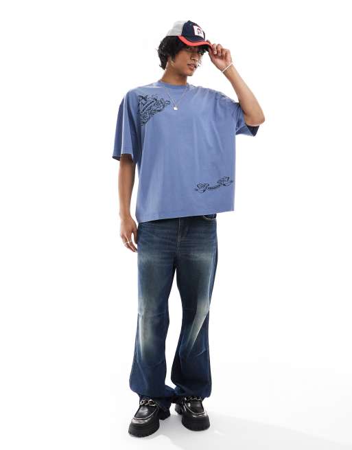 COLLUSION - Oversized stålblå T-shirt med grafisk engleprint
