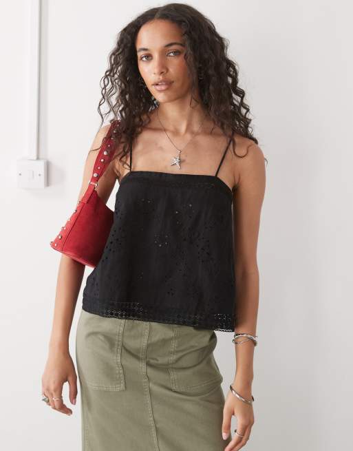 COLLUSION - Sort hæklet cami-top med åben ryg og patchwork-design