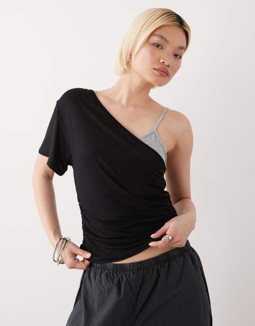 COLLUSION - Sort og grå camitop i to lag med offshoulder-design
