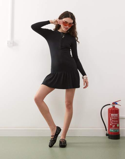 COLLUSION - Sort og ribstrikket Henley-minikjole med lavtsiddende talje