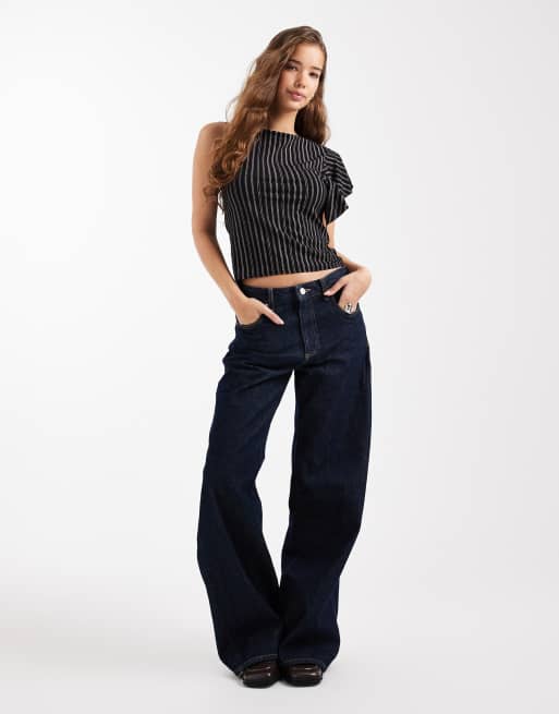COLLUSION - Sort oneshoulder-top med flæser og nålestriber