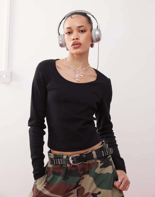 COLLUSION - Sort ribstrikket top med lange ærmer og firkantet hals