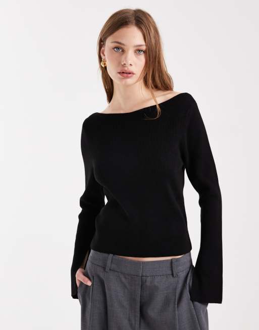 COLLUSION - Sort strikket top med bred halsudskæring og lange ærmer