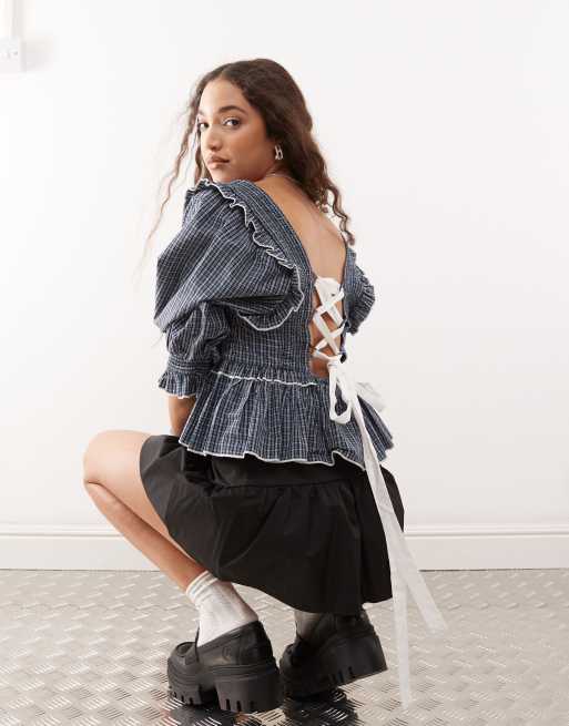COLLUSION - Ternet bluse med kontrasterende bindebånd og ekstremt rynkede pufærmer