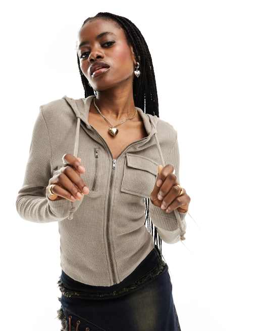 COLLUSION - Tætsiddende hættetrøje med vaffeltekstur i vasket brun