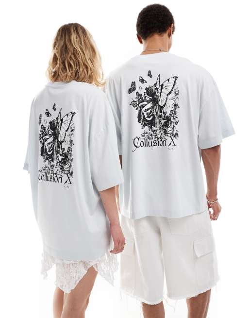 COLLUSION Unisex - Blå t-shirt med fegrafik på ryggen