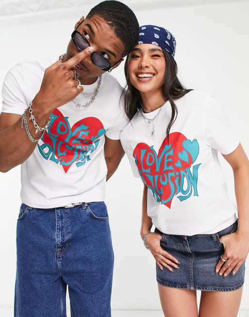 COLLUSION Unisex - Krympet t-shirt med hjerteprint i hvid