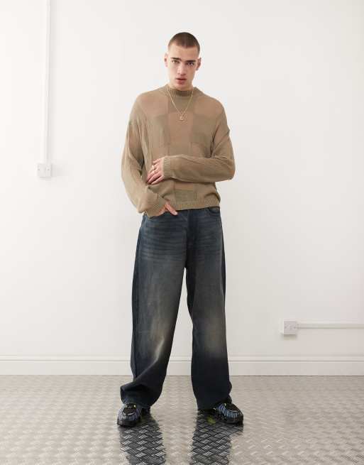 COLLUSION Unisex - Oversized strikket trøje med kakigrønne skaktern