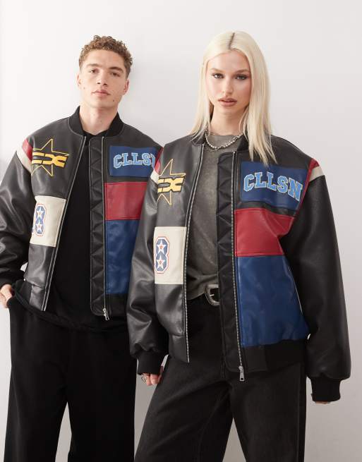 COLLUSION Unisex - Sort bomber-jakke med patchwork-design i læderlook