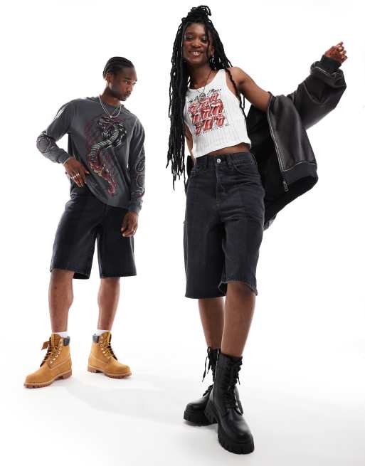 COLLUSION - Vaskede sorte skater-jorts med patchwork-design i denim