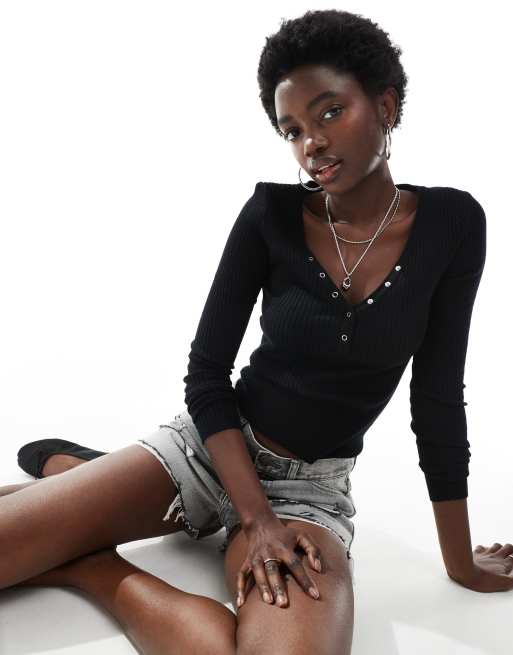 Cotton On - Ribstrikket og sort Henley-top med lange ærmer