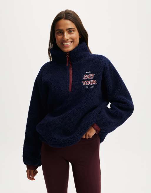 Cotton On - Mørkeblå pullover med halv lynlås og grafisk 'Ski Tour'-print