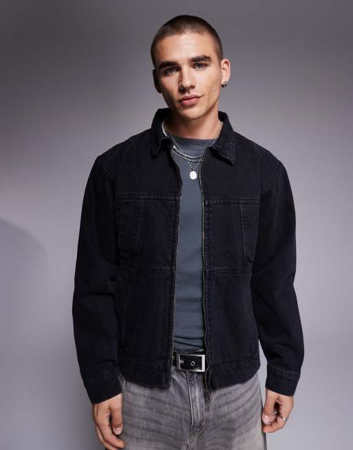 Courtside - Vasket sort denimjakke med lynlåsdetalje