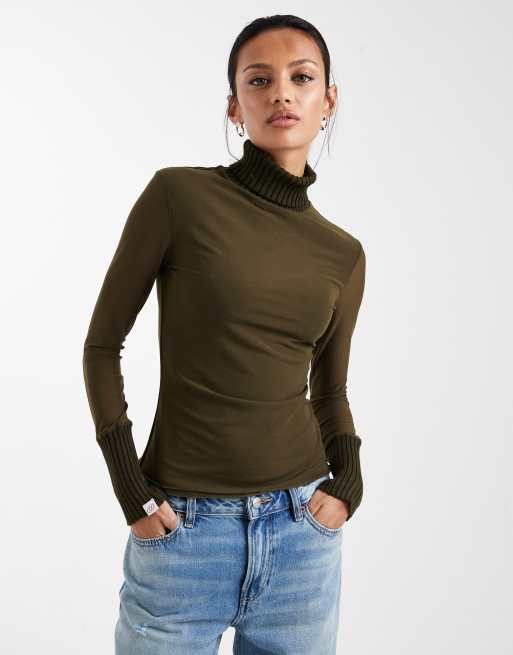 Daisy Street - Kakigrøn top med lange ærmer i strikket mesh