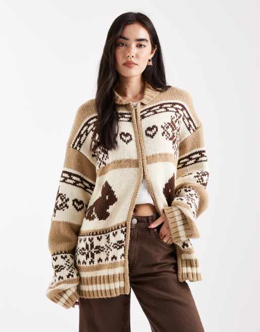 Daisy Street - Oversized cardigan med lynlås og kaningrafik i forskellige brune nuancer
