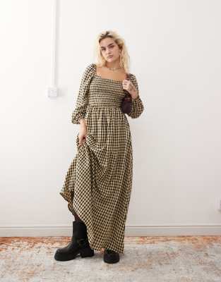 Daisy Street - Rynket maxikjole med sorte og beige tern