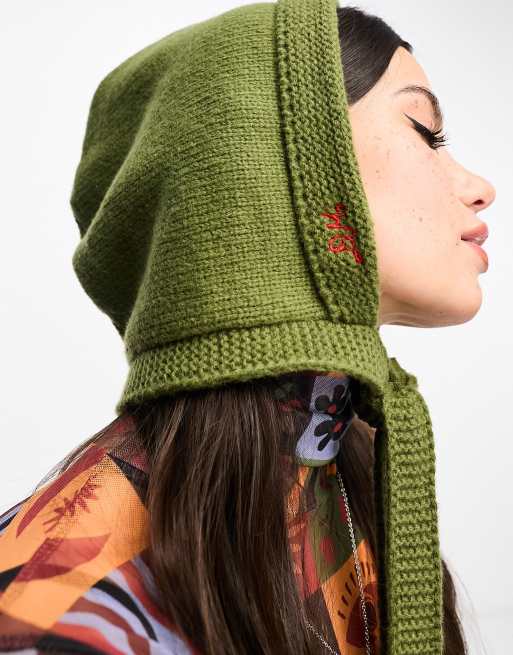 Damson Madder - Kakigrøn hættetrøje i strik med bindebånd foran og broderi