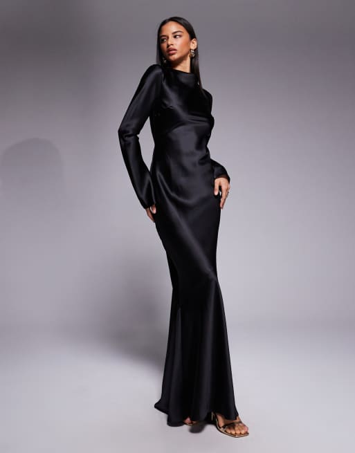 Daska - Langærmet sort maxikjole i satin med skråsnit og sømdetaljer
