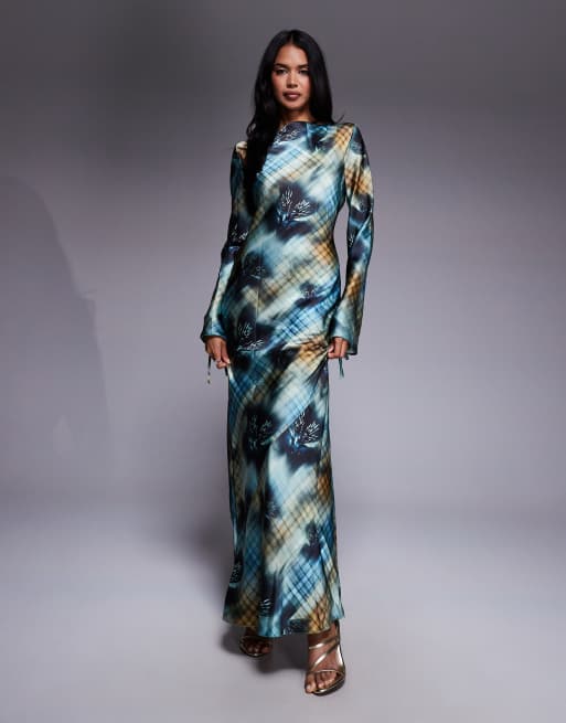 Daska - Maxikjole med blå abstrakte skotsktern i satin