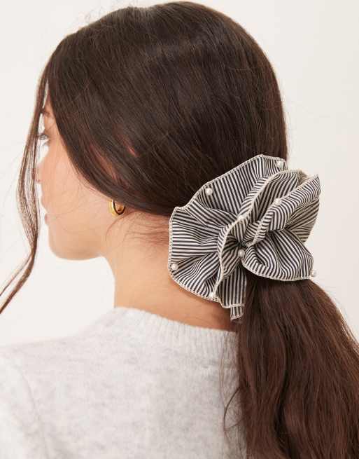 DesignB London - Sort og hvid scruchie med flæser, perledetaljer og striber