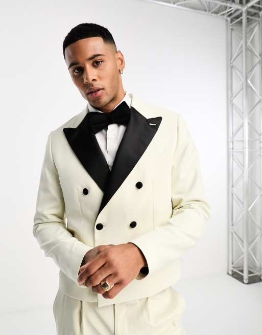 Devils Advocate - Cremefarvet, dobbeltradet og cropped habitjakke i slim fit med spids reverskrave i satin