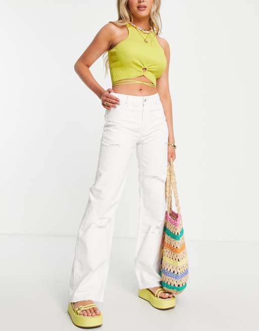 DTT - Hvide jeans med lige ben og rå kant og flænger på knæene