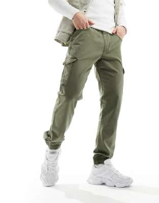 DTT - Kakigrønne cargobukser med tætsiddende buksekanter i slim fit