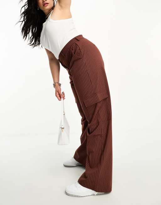DTT Plus - Højtaljede cargobukser med nålestriber i chokoladebrun