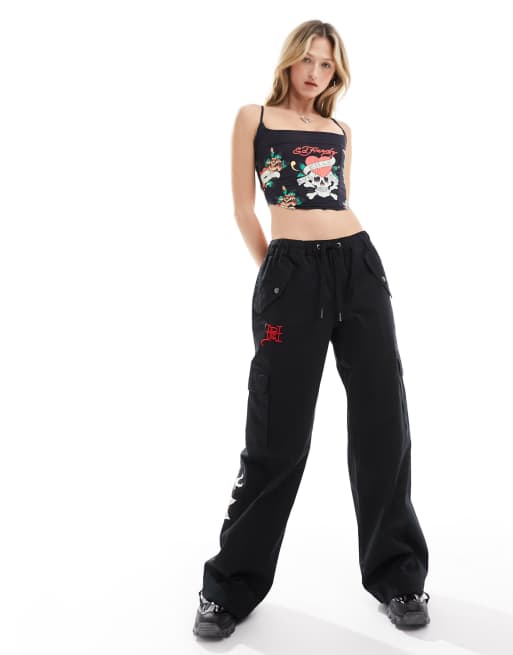Ed HArdy - Afslappede cargobukser med rødt tekstlogo bagpå