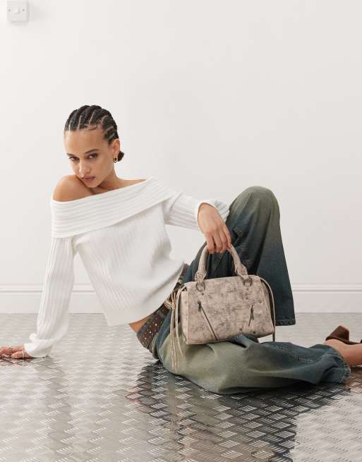 Edikted - Brandy - Ribstrikket og hvid offshoulder-trøje med foldet kant