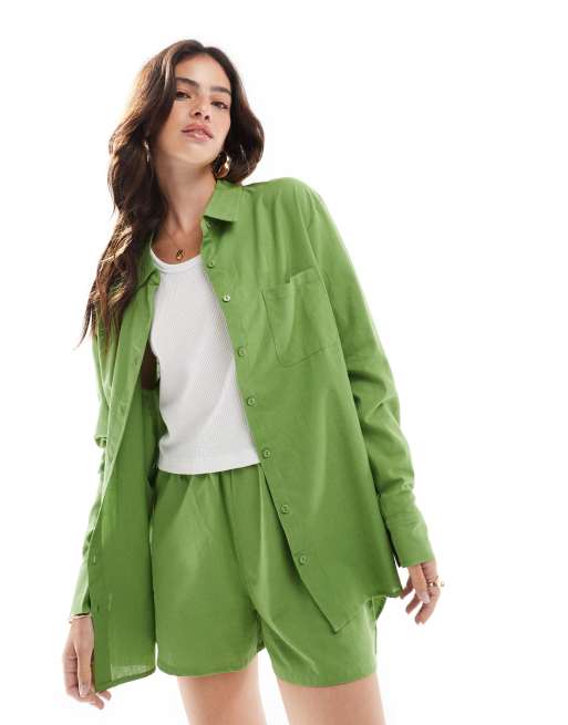 Esmée - Oversized strandskjorte med tekstur og lange ærmer i olivengrøn